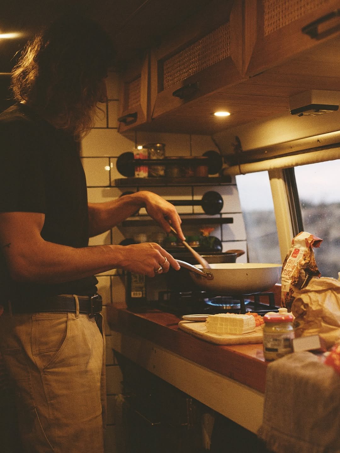 Genuine space designed for two. After five years in smaller vans, Rus offered stand-up headroom, a full kitchen with two-burner gas hob and oven/grill, queen-sized bed with high-quality mattress, and extensive storage throughout. Kendall: "This is going to be our home for the next week, week and a half. We could not be more stoked."