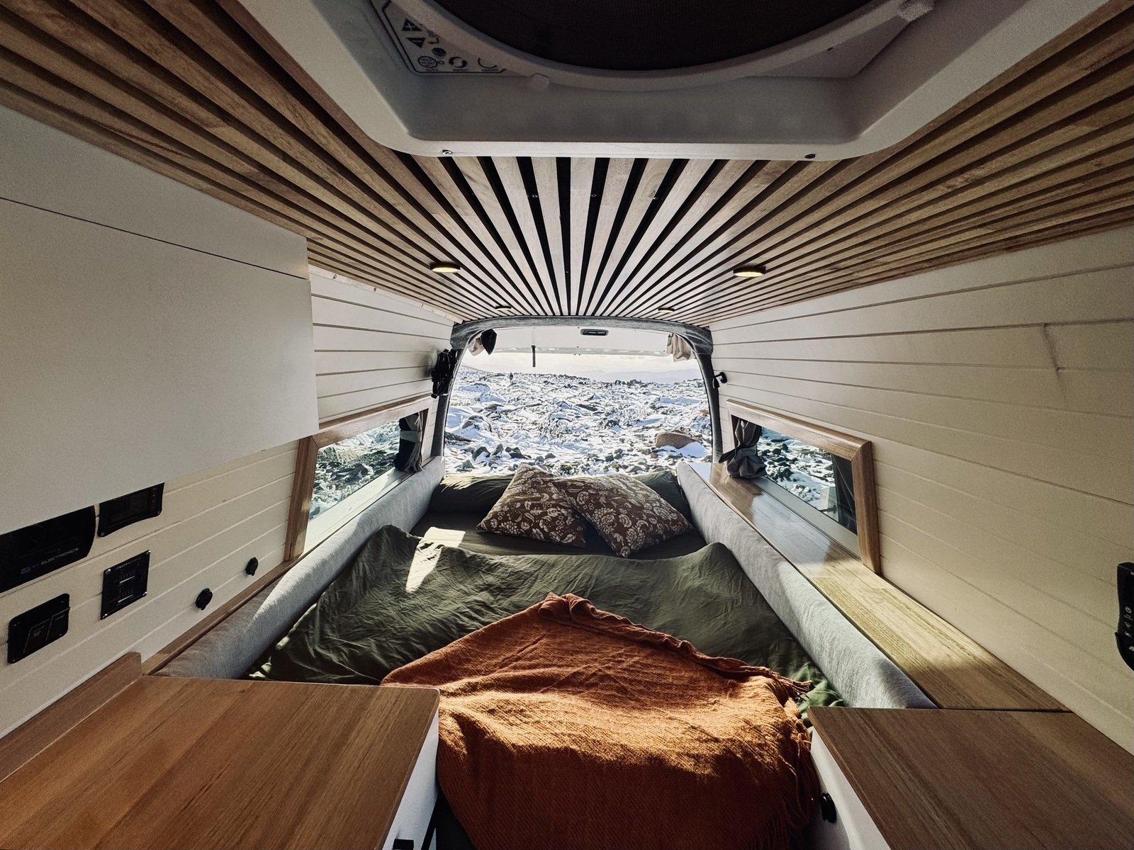 The next morning, Prince from Biami Campers delivered their campervan — Darlene, a Toyota Commuter finished with beautiful Tasmanian oak interiors. Brand new. Literally completed the day before.
