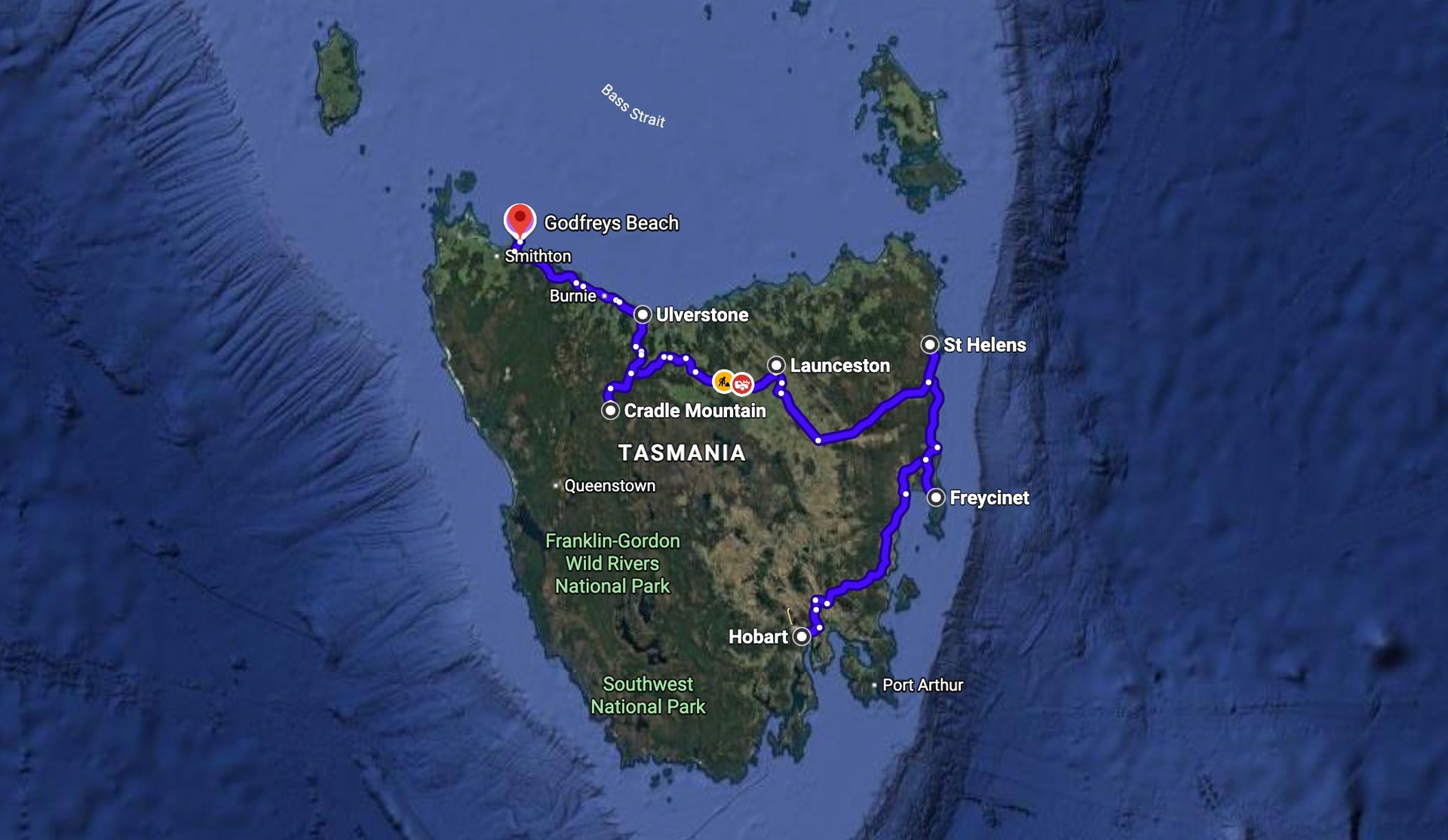 Route: Hobart → Freycinet → St Helens → Launceston → Cradle Mountain → Ulverstone → Stanley