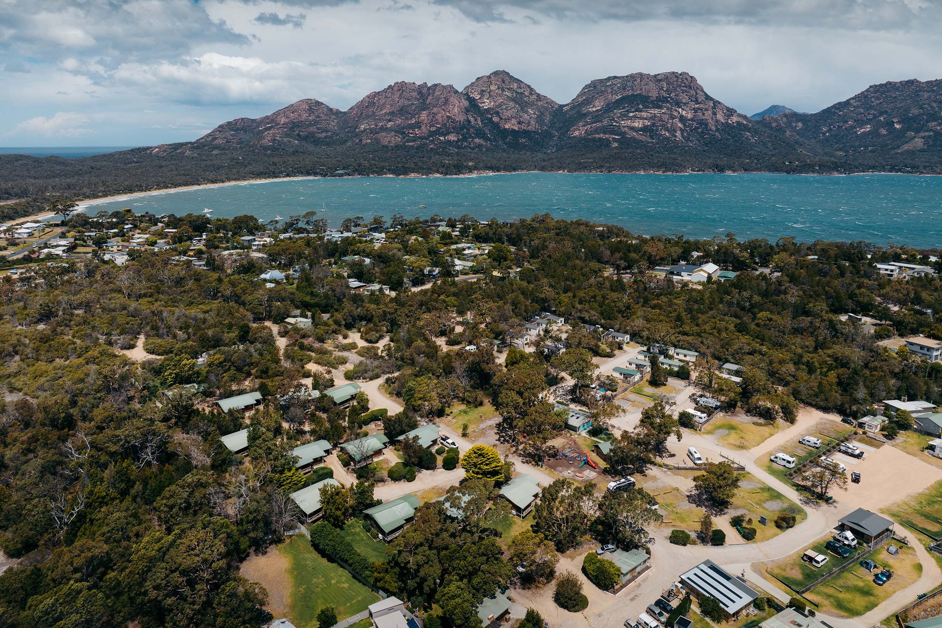 BIG4 Iluka on Freycinet, backed by the Hazards mountain range and the iconic Mount Amos (which you'll summit - if you're feeling adventurous).
