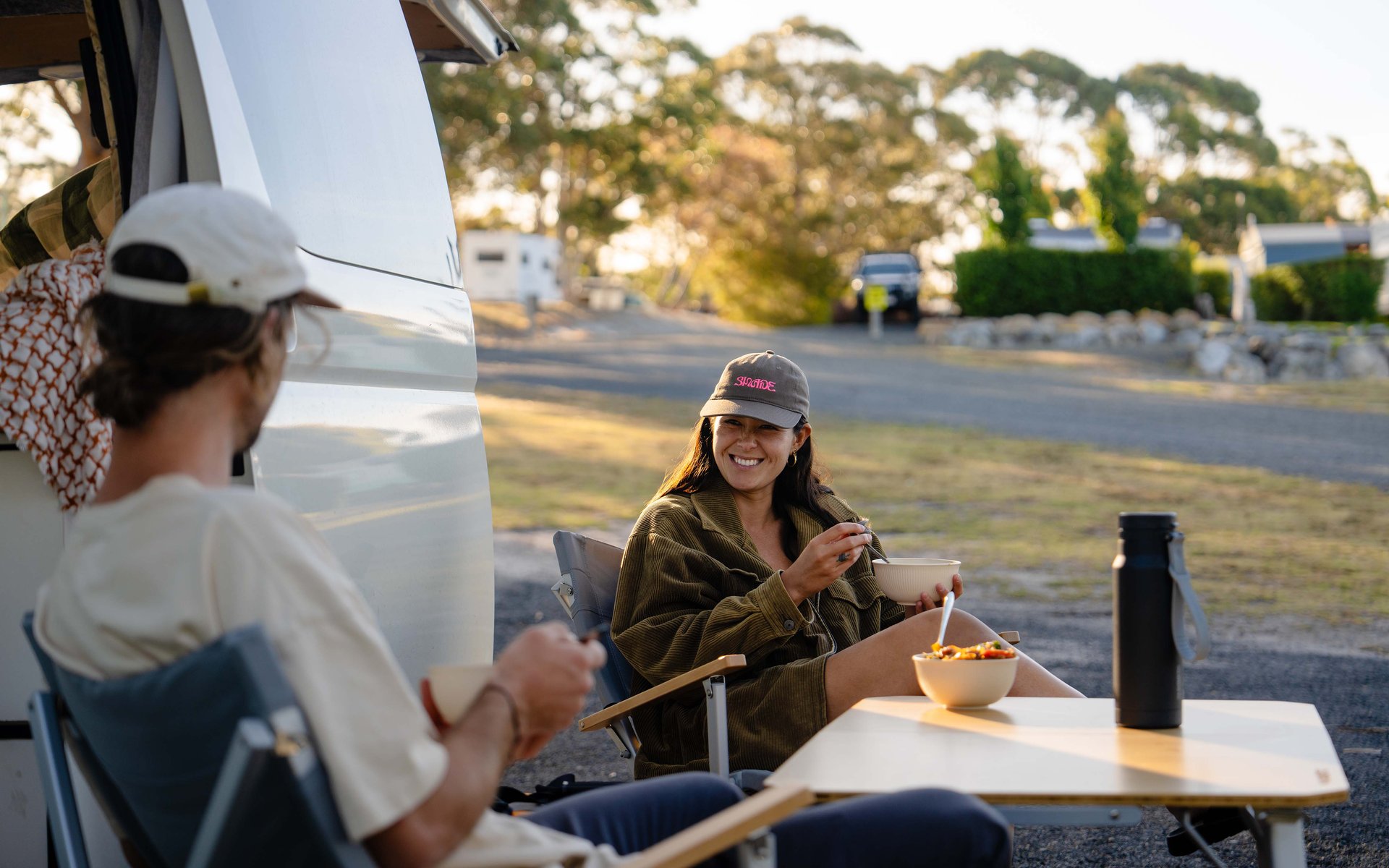 "We had a deluxe ensuite site with a fire pit," Adam describes. "We had the van set up, got Thai takeaway, and just sat outside with the fire going. Lots of beautiful bird sounds. It was just a very peaceful park."