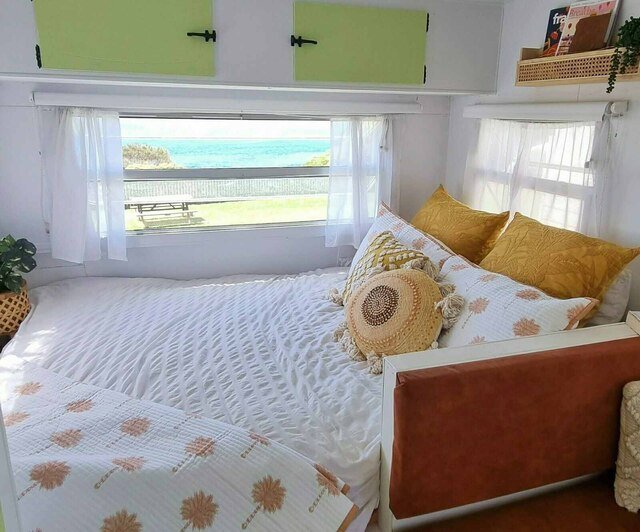 Picture this: you step inside this lovingly restored vintage caravan. The kettle whistles softly on the stove, mingling with the rich aroma of freshly brewed Nespresso from the included coffee pod/capsule machine. Outside, perhaps the gentle pitter-patter of winter rain on the roof creates a cosy backdrop, while inside, your furry friend (pets are welcome!) snuggles contentedly at your feet. And no matter the chill in the outside air, you're perfectly comfortable thanks to the included air conditioning , ensuring your personal climate is always just right.