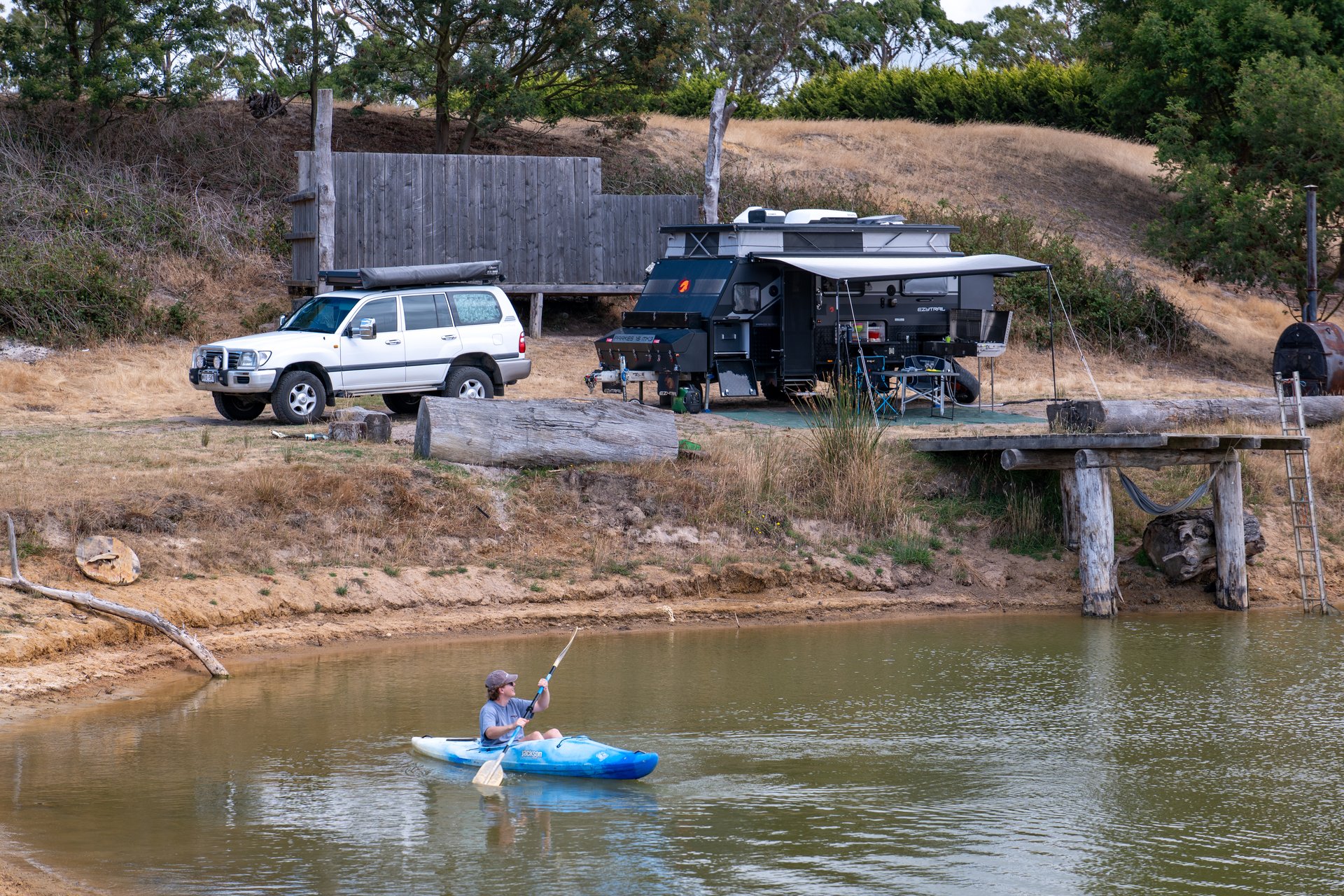 Rather than booking into a traditional caravan park, Elise chose something a little more private and “off-grid because we wanted the full caravan experience.” They booked a campsite at Wurdale Waters, a Hipcamp property near Winchelsea in Victoria, just 10 minutes from the Great Ocean Road.