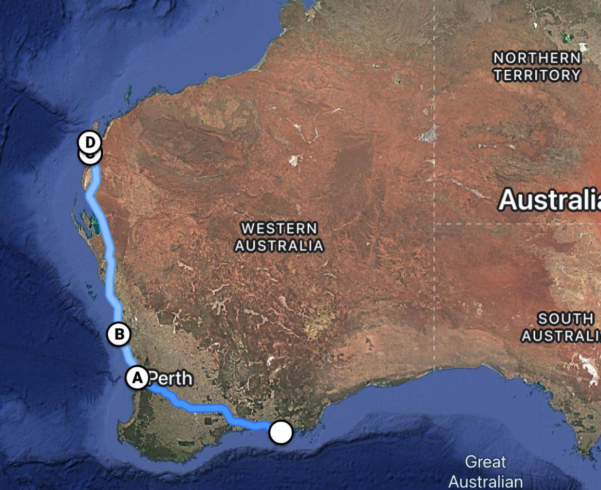 Distance: Approximately 2,500km from Perth to Ningaloo Reef and back